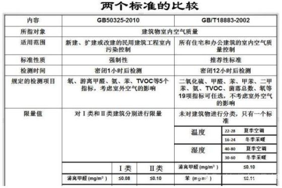目前,行業(yè)有兩個現(xiàn)行國家標準可以參考,一個是GB50325-2010,另一個是GB/T18883-2002,前者是強制性標準,后者是推薦下標準,關于兩者的區(qū)別如圖所示: